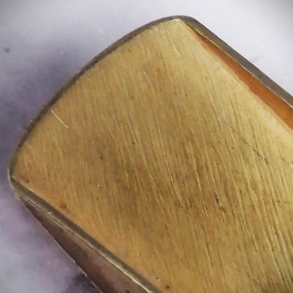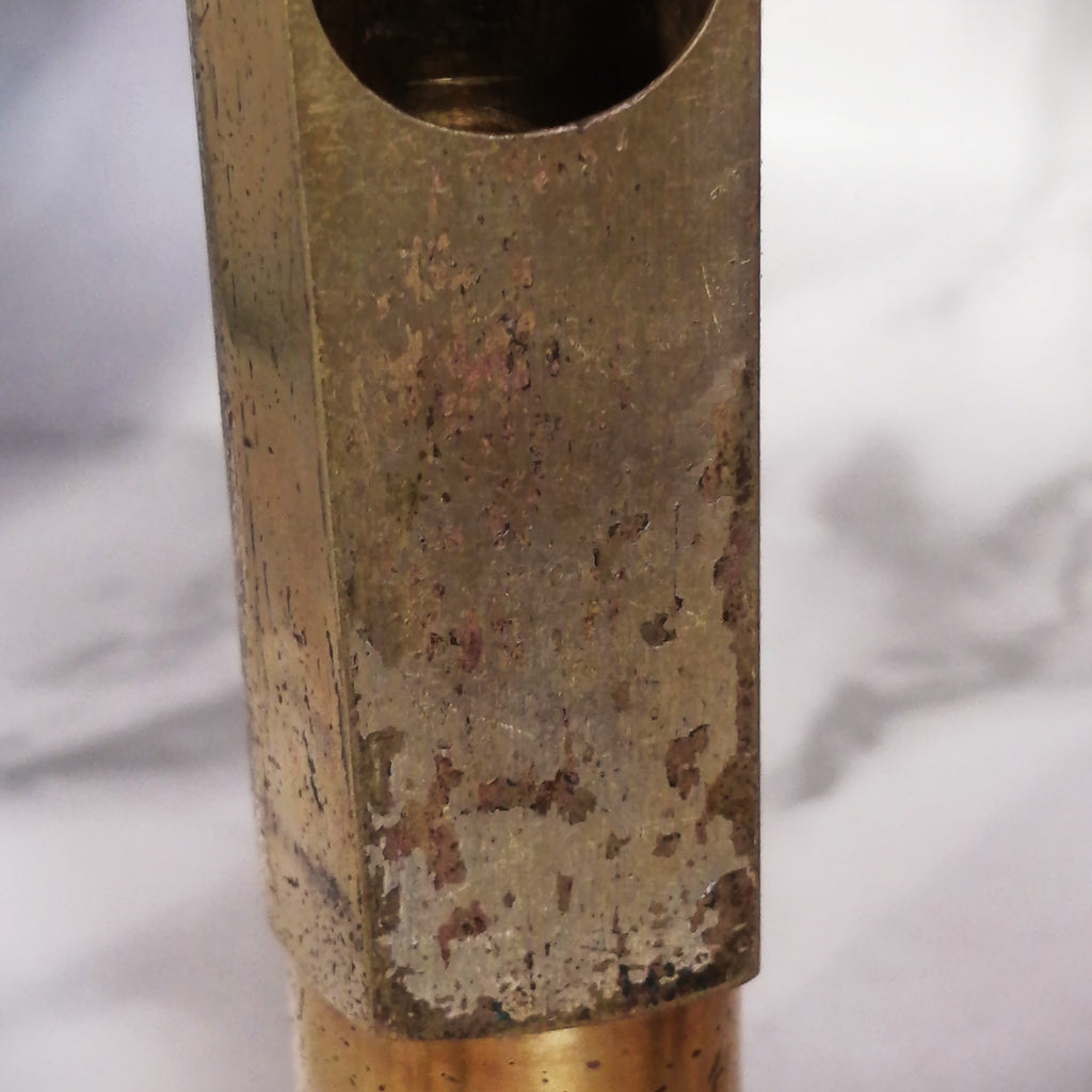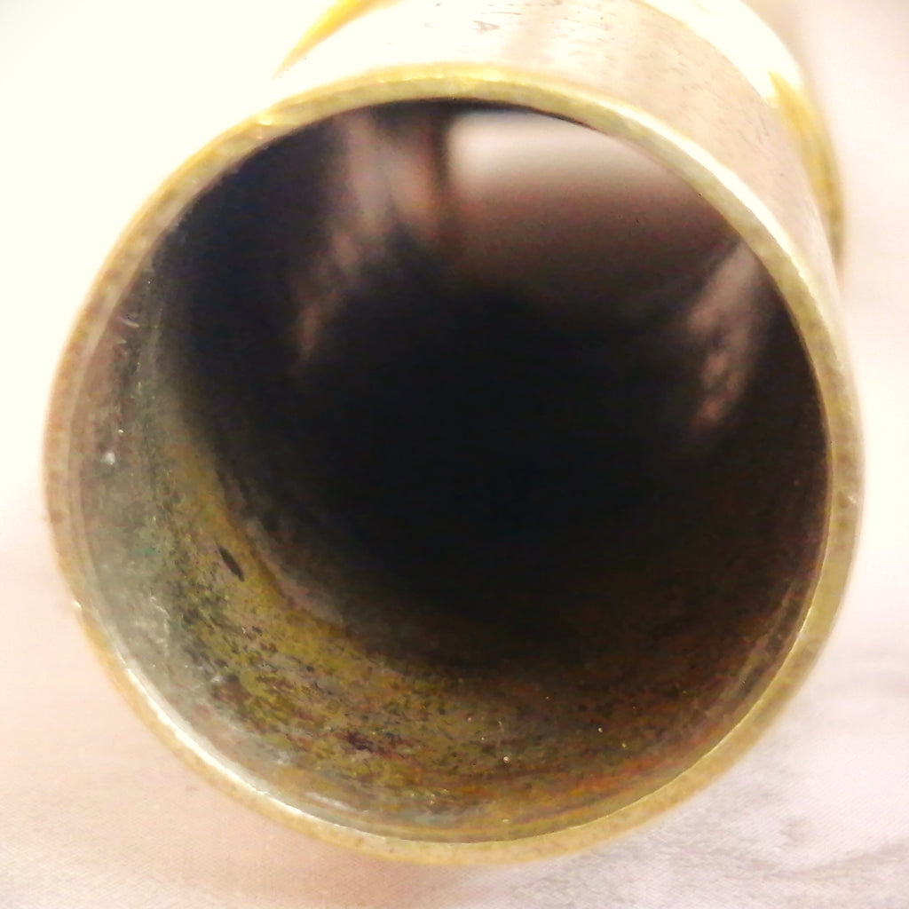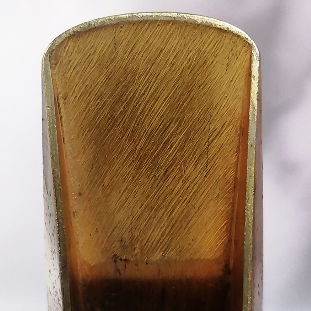 This piece is a great example of gear that was used a lot but also well maintained. Of course, this mouthpiece shows signs of the typical plating wear that all handmade Guardalas eventually suffer but the facing still maintains a clean break at 25mm and measures evenly from top to bottom. There is some visible wear to the bite area that was made from old school pink dental acrylic. Tooth wear can be filled in but I prefer to leave that up to the customer.