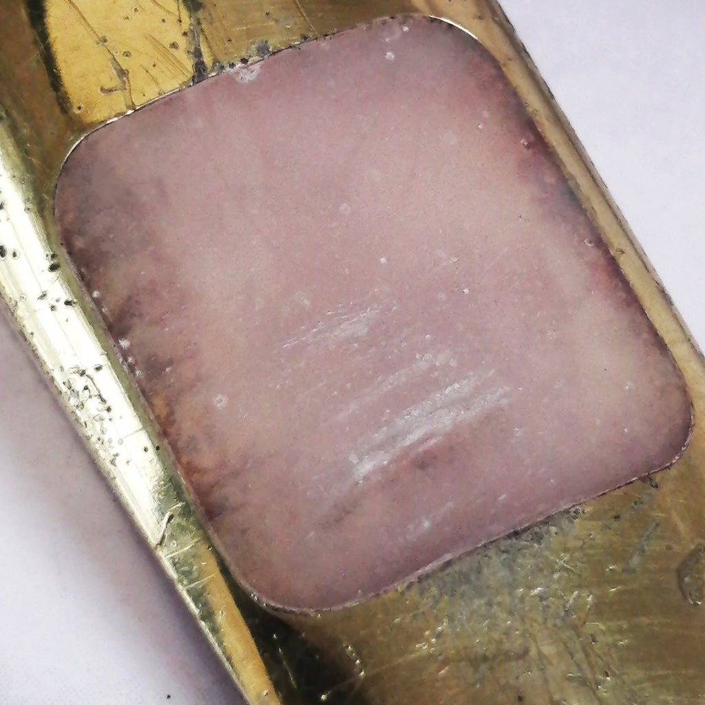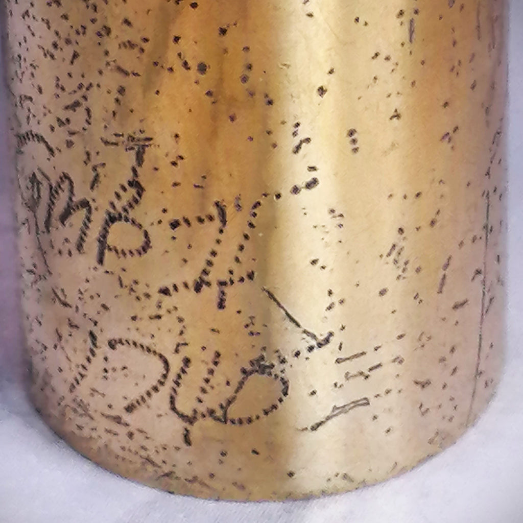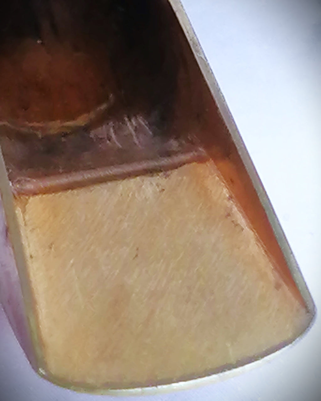 This piece is a great example of gear that was used a lot but also well maintained. Of course, this mouthpiece shows signs of the typical plating wear that all handmade Guardalas eventually suffer but the facing still maintains a clean break at 25mm and measures evenly from top to bottom. There is some visible wear to the bite area that was made from old school pink dental acrylic. Tooth wear can be filled in but I prefer to leave that up to the customer.